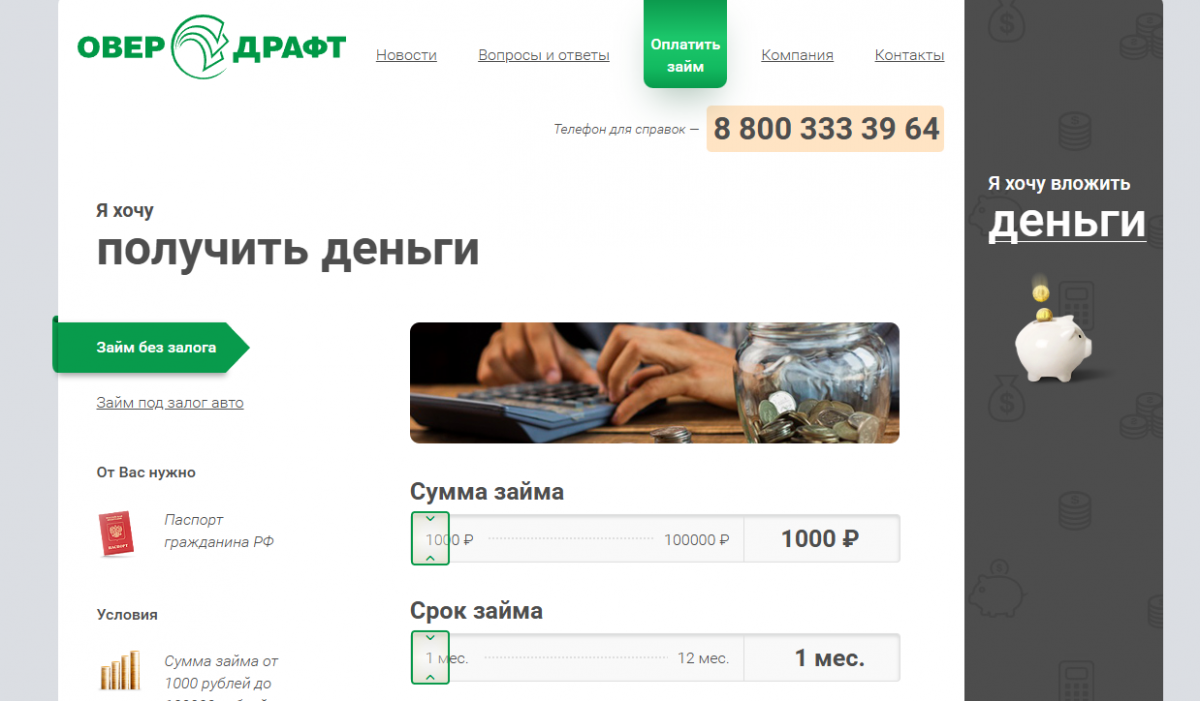 Микрофинансовая организация ОверДрафт специализируется на крупных займах с длительным периодом погашения. Деньги выдаются только гражданам РФ в возрасте с 18 лет с регулярным источником дохода, достаточным для исполнения долговых обязательств перед МФО. Для оформления договора требуется только паспорт. Получить микрокредит можно на карту банка или наличными в офисах компании.