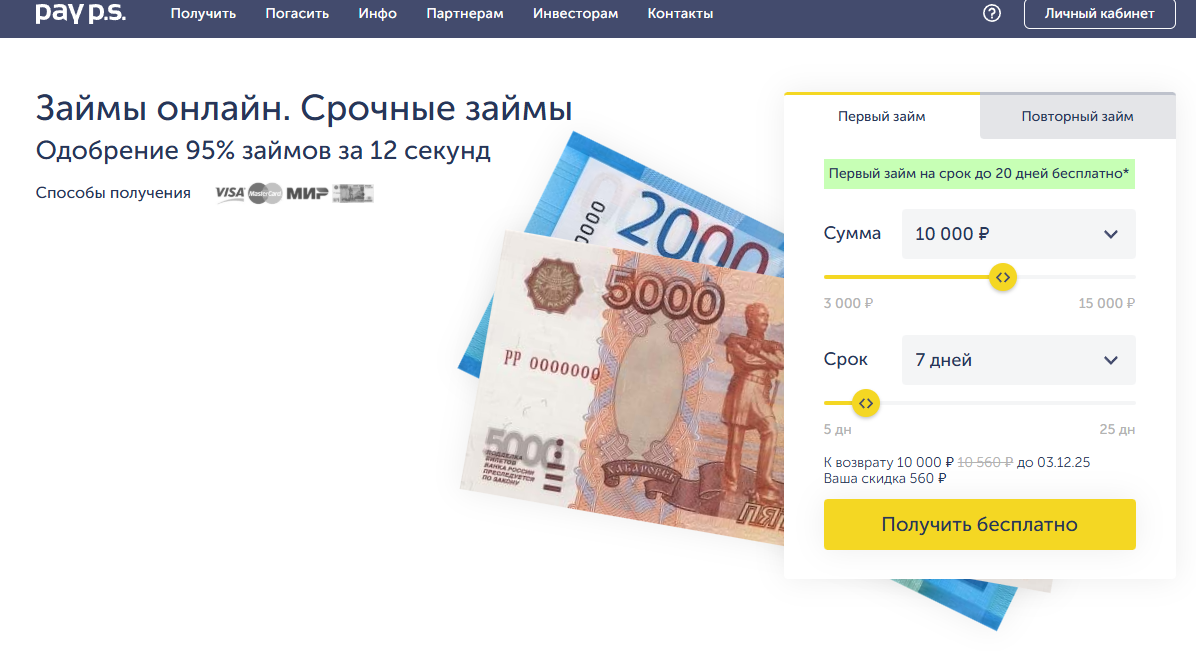 В компании Pay PS физические лица могут получить от 1000 до 100.000 рублей сроком на 5-365 дней по ставке до 0,8% в день или до 292,000% годовых. При первом обращении действует займ без процентов на срок до 20 дней с максимальным лимитом в 15.000 рублей. Постоянным клиентам компания предлагает от 3000 до 100.000 рублей с возможностью продления договора. Для подключения пролонгации нужно оплатить 10% от первоначальной суммы микрозайма и начисленных за весь период процентов.
