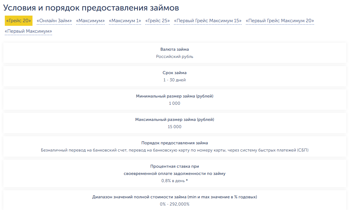 Минимальный размер займа - 1000 рублей, а максимальный - 100 000 рублей. Пользоваться деньгами можно в течение 6 месяцев, оплата долга осуществляется единоразово в дату, указанную в договоре. Размер комиссии устанавливается на отметке 0,79% в день или 282% годовых..