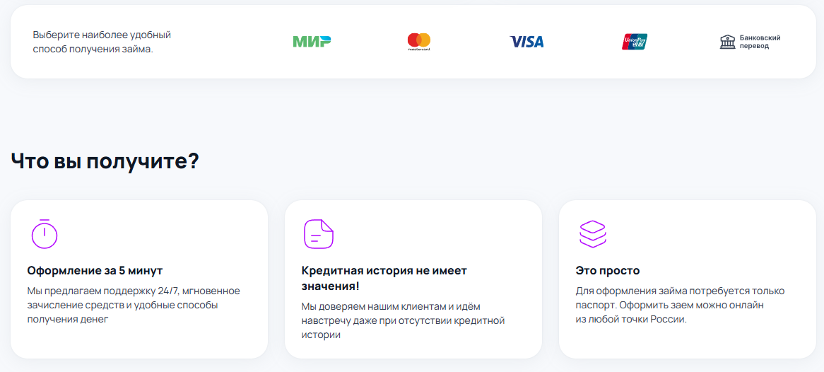 | Банковский перевод | До 3 дней | Счет должен быть открыт на имя заёмщика |