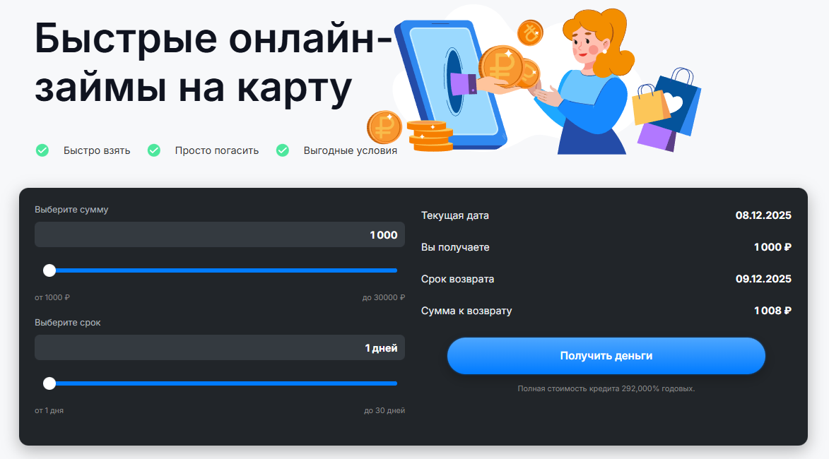 Сумма Срок Одобрение 2000 - 30 000 ₽ 7 - 30 дней 85% Ставка ПСК Возраст 0 - 0,8% в день 0 - 292,000% в год 18 - 75 лет Повторно Время Продление 2000 - 30 000 ₽ 2 минуты Да - 0%