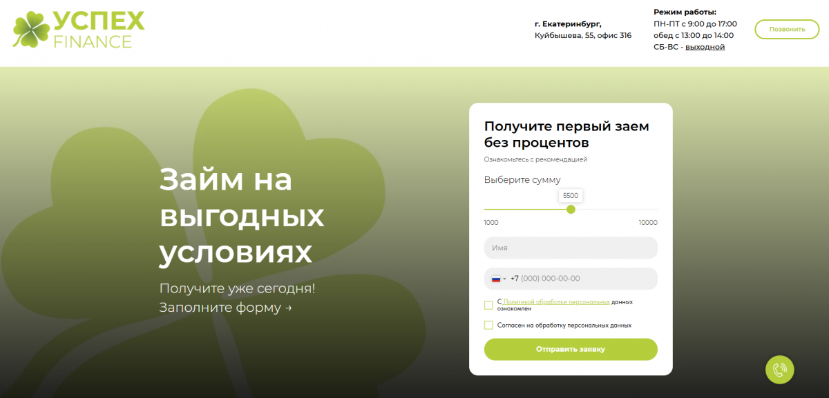 Компания Успех Финанс предлагает получить займ на карту или наличными без отказа и проверок. Регистрационный номер записи в государственном реестре микрофинансовых организаций – №2403465010020, дата внесения 05.02.2024 года. Воспользоваться услугами МФО могут все дееспособные российские граждане в возрасте от 18 до 75 лет. Деньги переводятся на банковскую карту или выдаются в главном офисе кредитора.