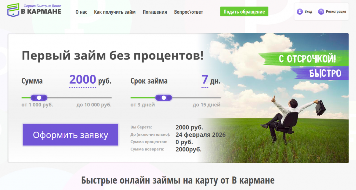 Микрокредитная компания «В кармане» выдает займы с переводом на карту и наличными без обеспечения. Рассмотрение заявки занимает 10 минут, а зачисление денег происходит моментально. Для оформления договора нужен паспорт РФ и СНИЛС.