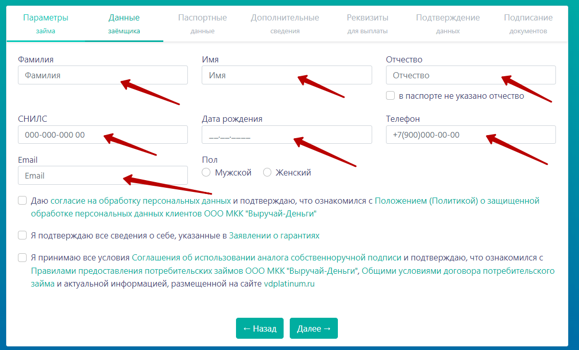 - Введите в анкету все запрашиваемые сведения, включая ФИО, дату рождения, номер мобильного, ежемесячный доход в рублях, серию, номер и дату выдачи паспорта, код подразделения, номер СНИЛС, кем выдан паспорт