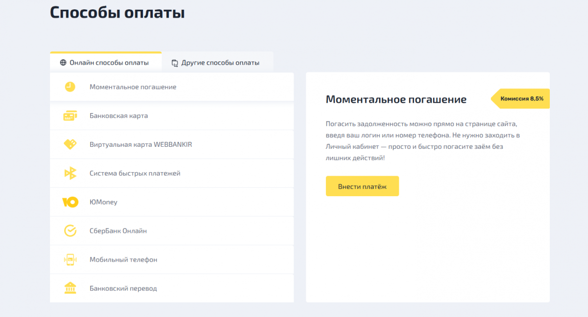 Погасить задолженность в Вэббанкир можно 7 способов – на сайте компании без авторизации, с банковской карточки и переводом в отделении, через терминалы, онлайн-банк, с электронных кошельков, мобильного телефона, через СБП. Дополнительные проценты за досрочное погашение не взимаются.