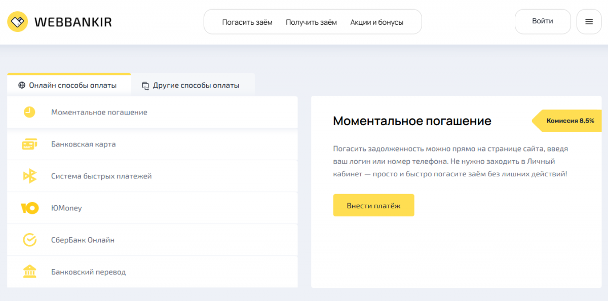 Погасить задолженность в Вэббанкир можно 12 способами: Почтой России без комиссии, на сайте без авторизации, картой, переводом по реквизитам, Сбербанк Онлайн, ЮМани, мобильного телефона, Золотая Корона, СБП, в терминалах МКБ и Элекснет.