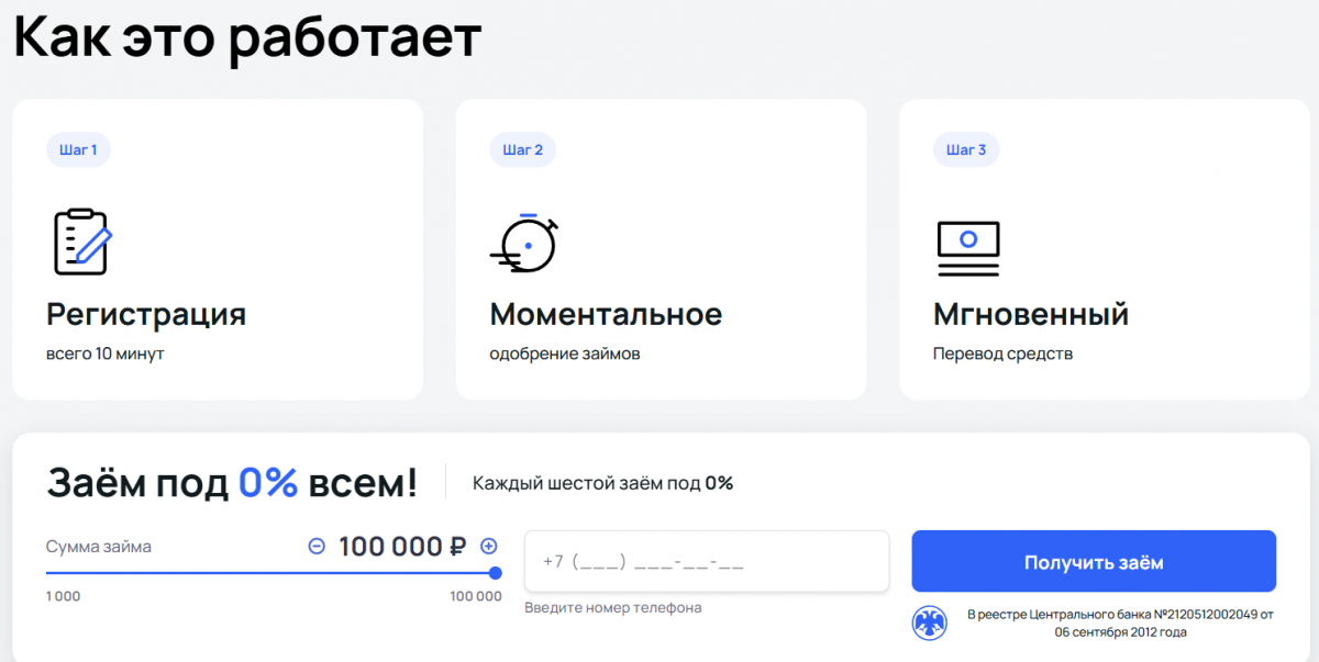 Потребительский заем выдается на сумму от 1000 до 30000 рублей для новых клиентов по ставке 0% в день на срок до 30 дней. Для постоянных заёмщиков лимиты увеличиваются до 100 тысяч рублей на срок до 364 дней. Диапазон полной стоимости микрозайма от 0 % до