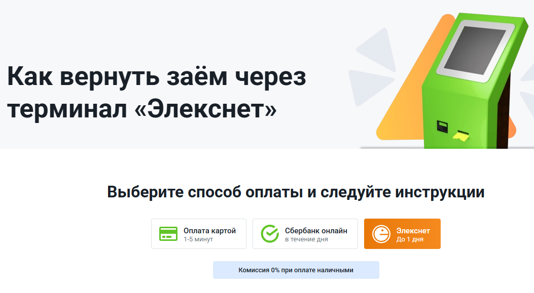 Займер предлагает 4 способа погашения задолженности, в том числе с банковской карты, безналичным переводом, через терминалы Элекснет и в Сбербанк Онлайн. Дополнительные проценты за досрочное погашение не предусмотрены, оплата берется только за фактический срок пользования деньгами.