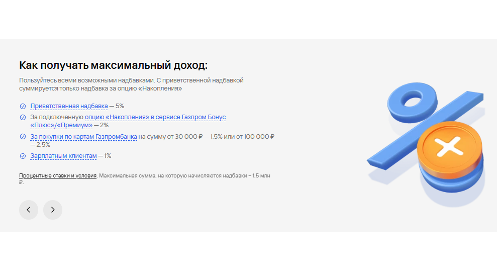 Максимальная доходность по депозиту достигается за счет надбавок, которые увеличивают процентную ставку по договору. К ним стоит отнести: