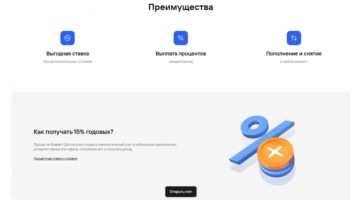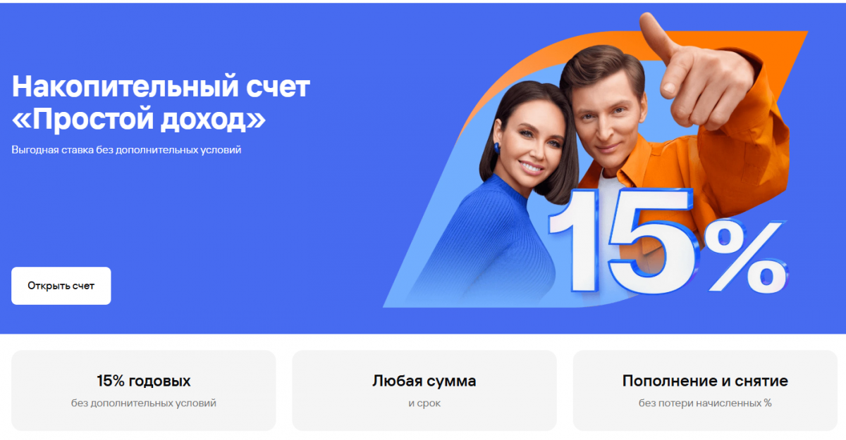 Накопительный счет «Простой доход» открывается на любой срок с минимальным порогом для входа от 1 рубля. Процентная ставка 15% годовых - фиксированная без каких-либо условий, устанавливается в индивидуальных условиях договора и не подлежит изменению до конца срока размещения денежных средств. По тарифу доступно пополнение и снятие наличных без ограничений. При закрытии вклада с суммой более 200 000 рублей рекомендуется заказывать наличные за 2 рабочих дня до даты осуществления операции.