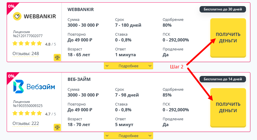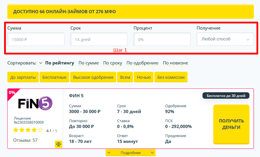Шаг 1. В фильтре укажите сумму и срок займа, сравните МФО по условиям и одобрению, и выберите подходящее предложение.